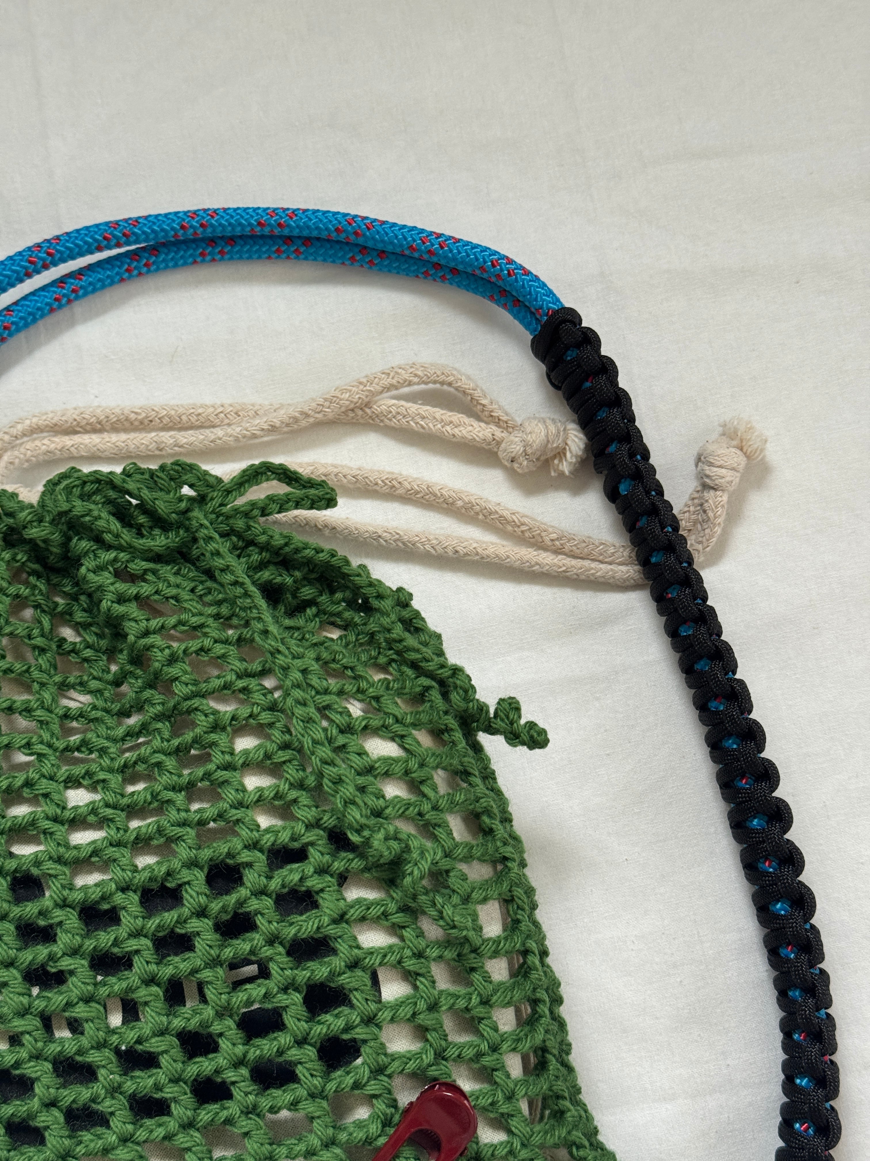 ・ロープショルダーにはパラコード を使用。ニットバッグを取り外して、キーショルダーとして使用するなど、使い方は様々。