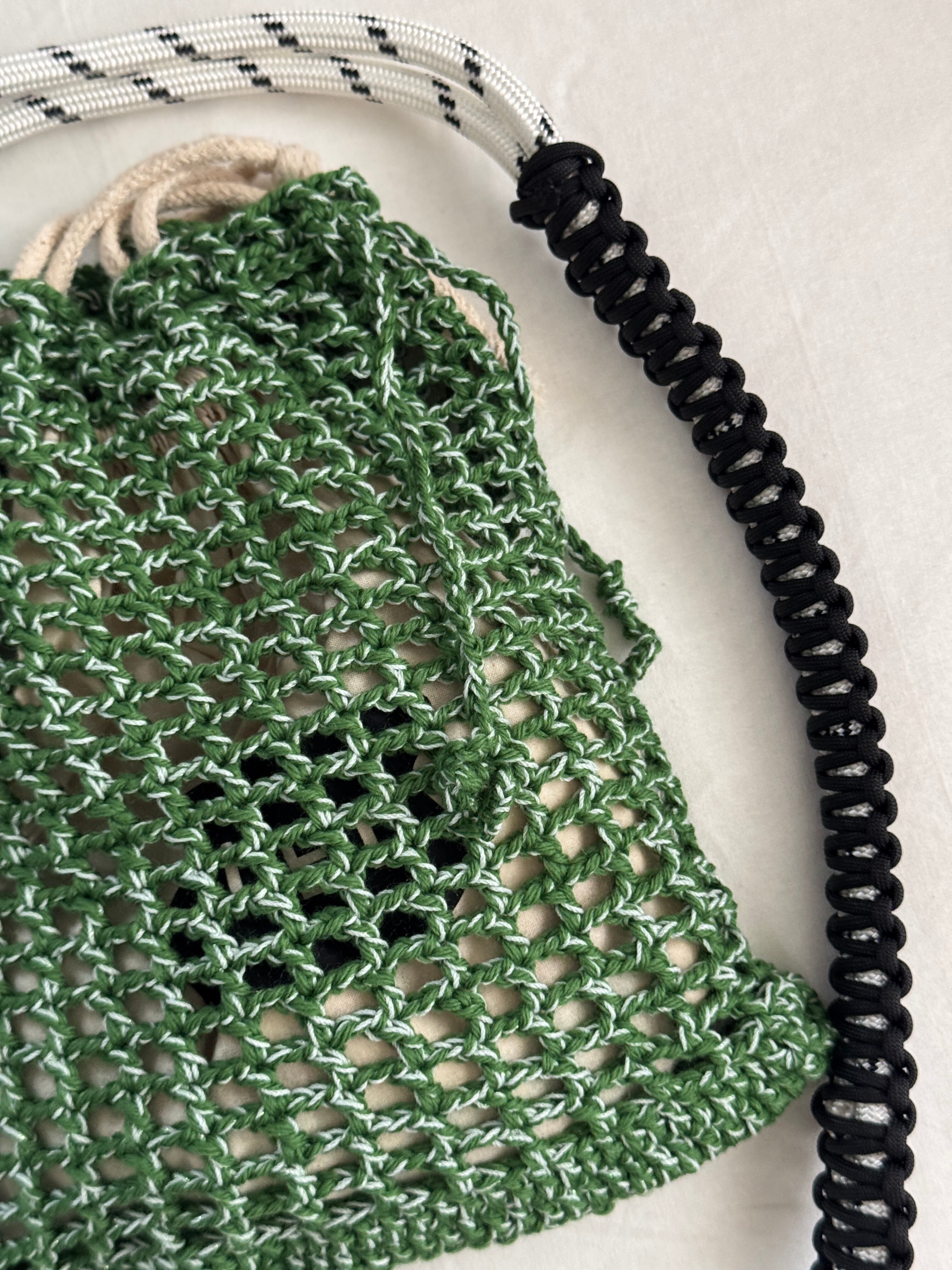 ・ロープショルダーにはパラコード を使用。ニットバッグを取り外して、キーショルダーとして使用するなど、使い方は様々。