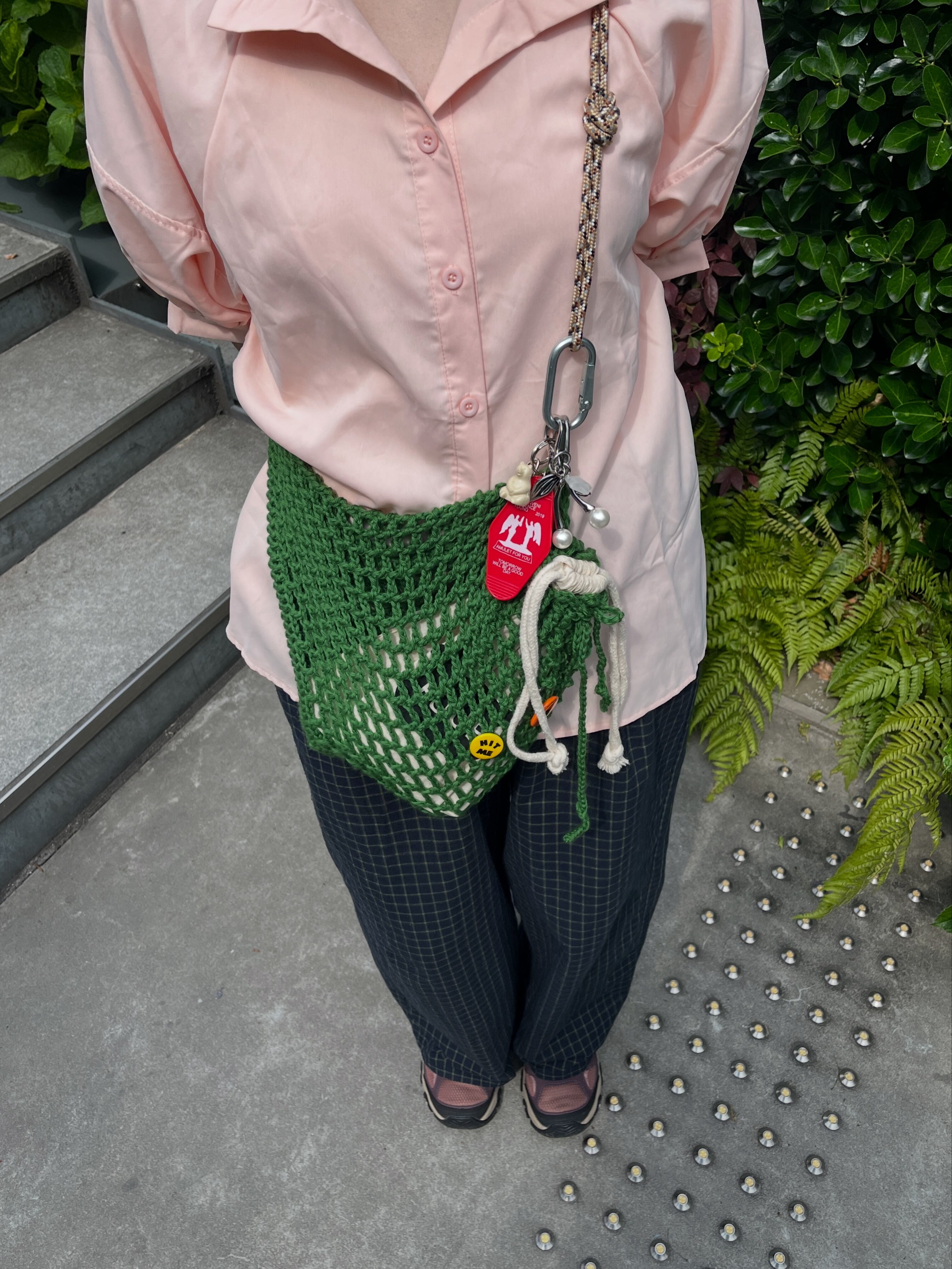 ・ロープショルダーにはパラコード を使用。ニットバッグを取り外して、キーショルダーとして使用するなど、使い方は様々。