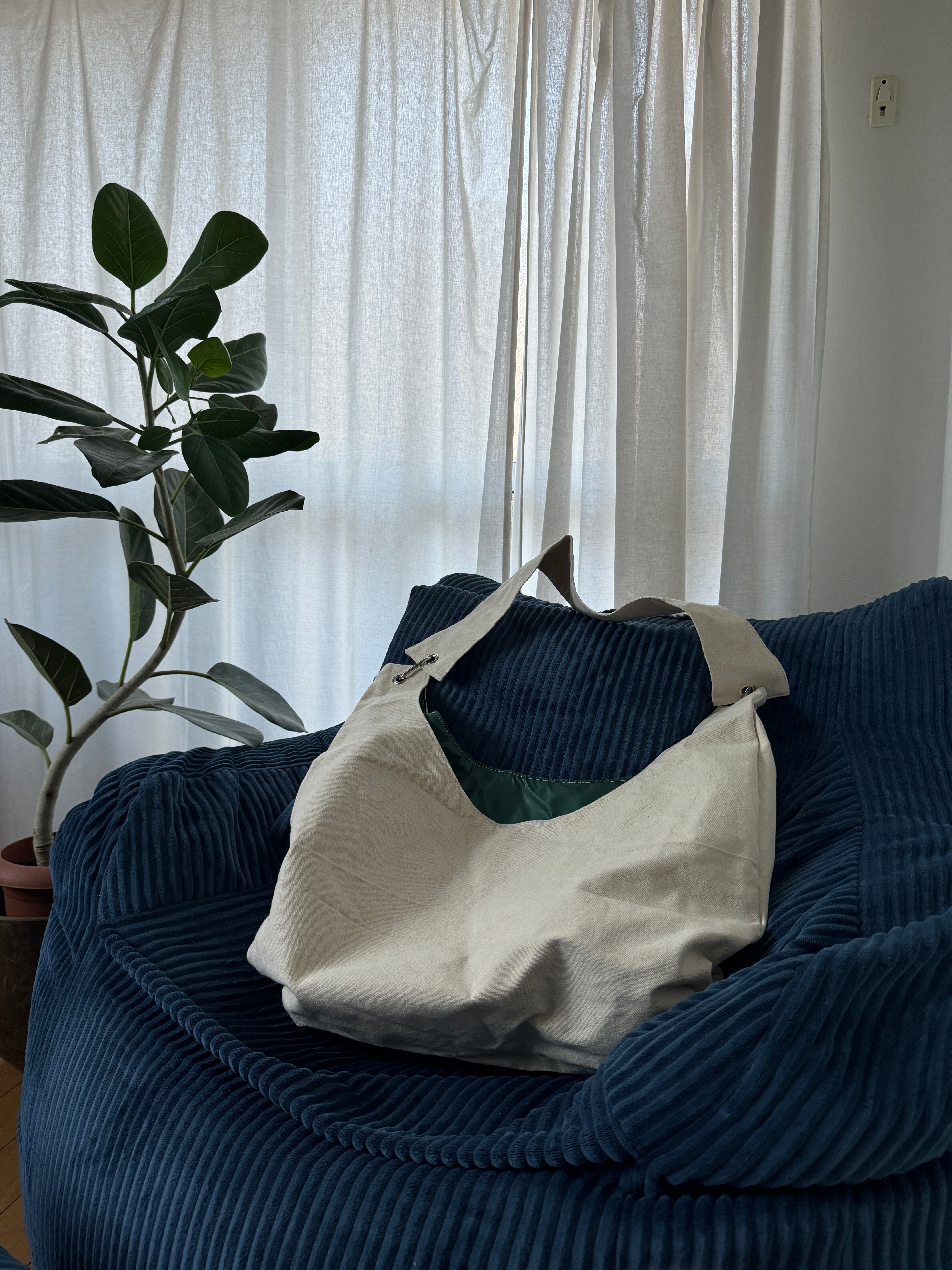 11号帆布(キャンバス)を表地に使用し、裏地にはリップストップナイロンを使用した2WAYショルダーバッグ。